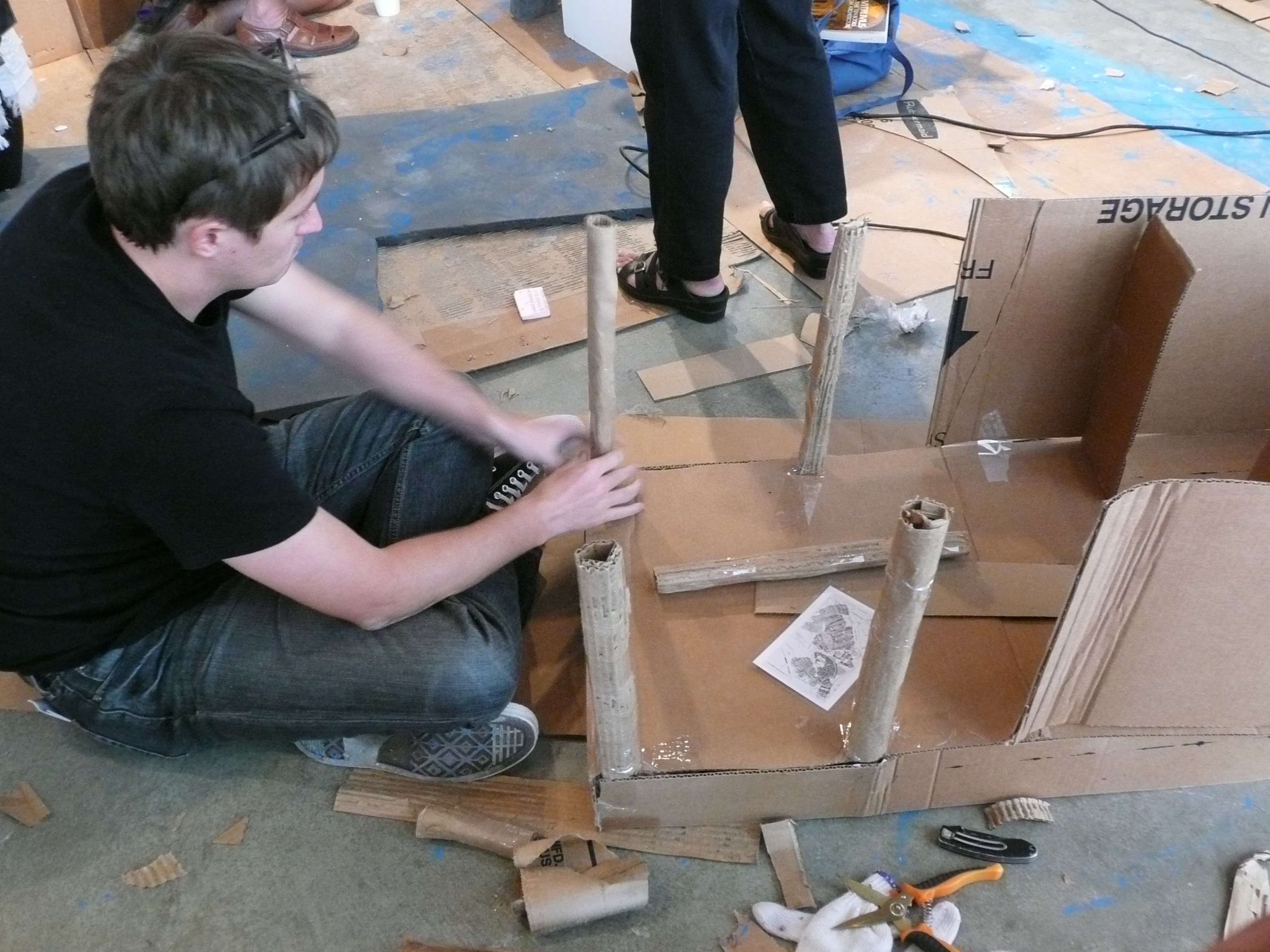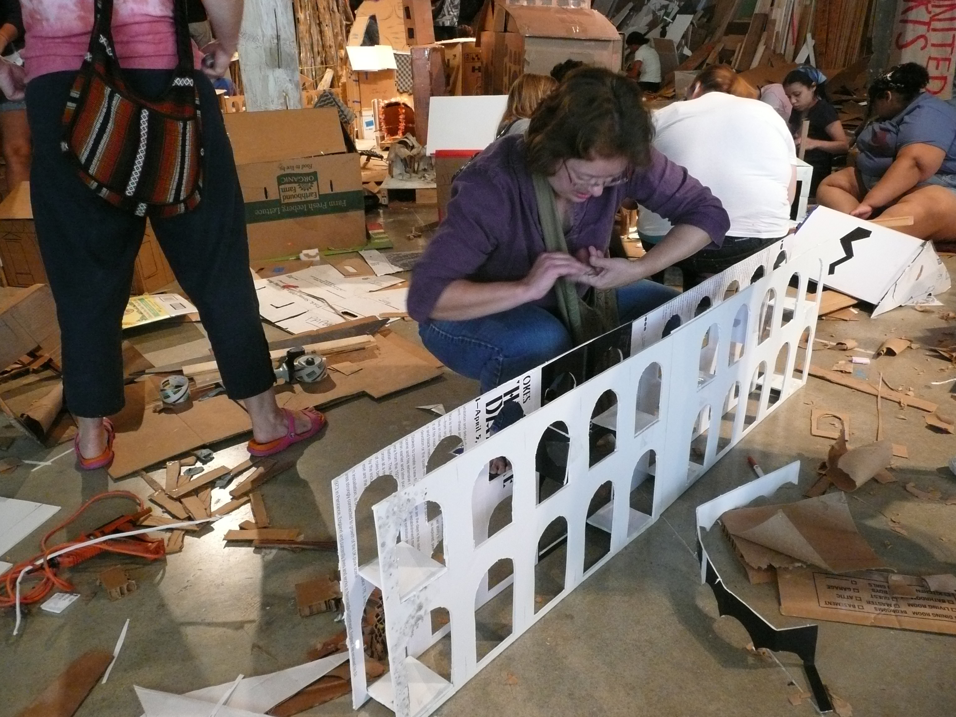 Artist Liz Glynn handed volunteers laminated cards with a structure on them, and then you used your ingenuity and a pile of scrap cardboard and lumber to make the buildings.