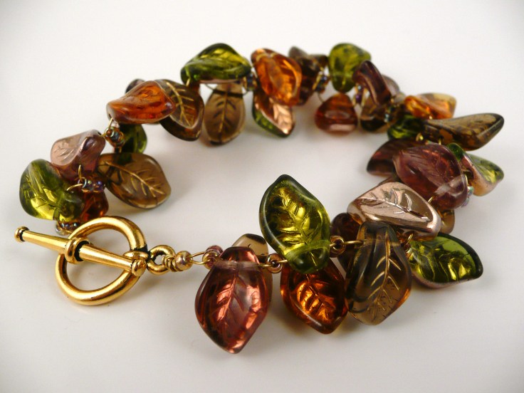It’s been a lovely Thanksgiving Day here, and to celebrate, here’s a little tribute to a beautiful bracelet design by Shanna Steele of Auntie’s Beads in Southlake. It uses Czech pressed-glass beads shaped like leaves, with rich colors and coppery highlights.