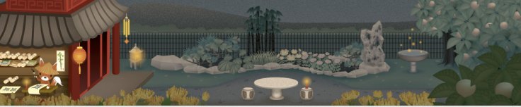 At about 1:20 a.m., if you’re up late writing, you’re not alone. Google’s Teahouse Fox is doing brushwork by candlelight. She has apparently been outside, as there is a taper still lit in the garden. And fireflies hover over her birdbath.
