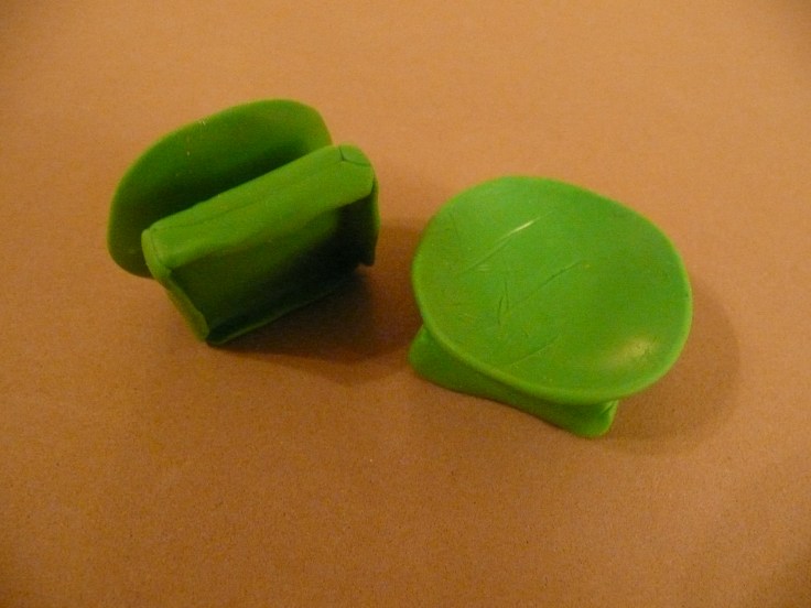 I made the egg cups from Fimo polymer clay, about $2 at hobby stores. (Cover a wooden endpiece in plastic wrap and mold the square bases on that. For the cups, press a flat circle of clay onto a plastic egg, also covered in plastic wrap.) Polymer clay bakes up at home oven temperatures. It’s mighty stuff.