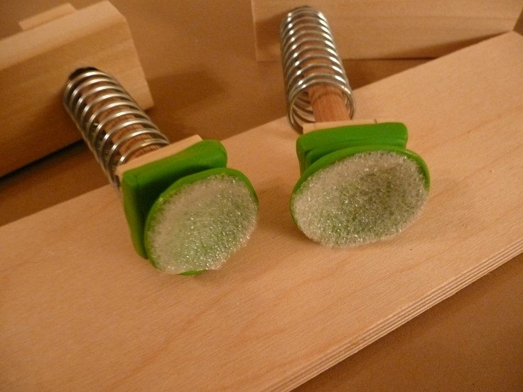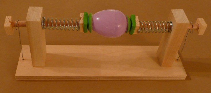 The springs I found were a little bigger than I needed, so I used a pretty big dowel and uprights. Assemble these upright parts first and then judge carefully how far apart you need to place them on the base. Too close together = too much pressure on the egg. Too far apart = not enough tension to hold the egg. This totally depends on your individual springs. When you get it right, glue them to the base.