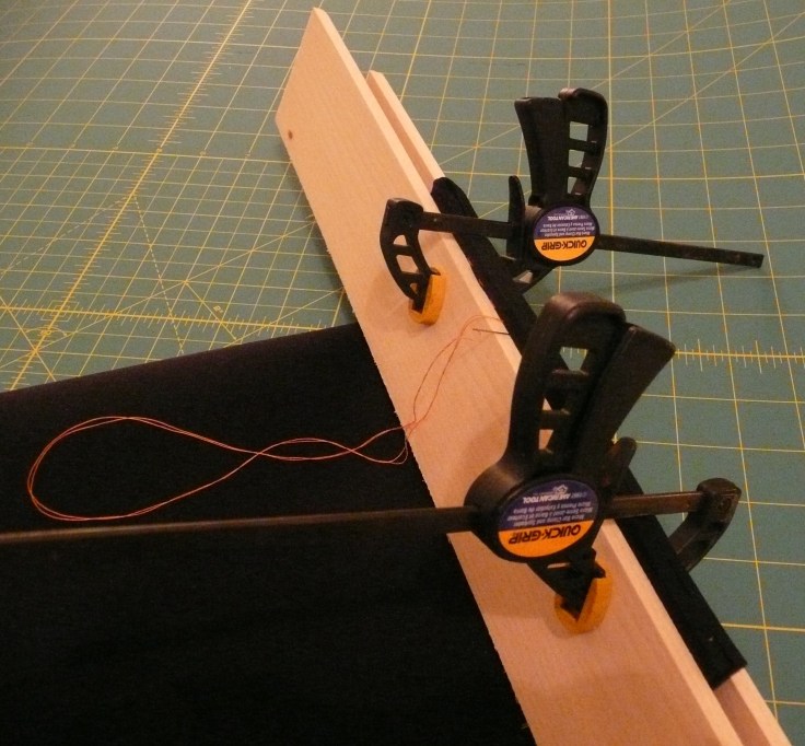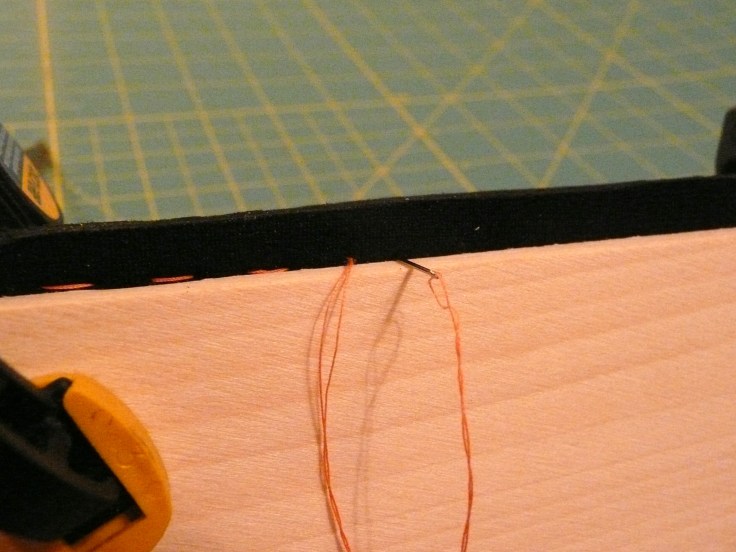 You can see there, the wood is thick enough you can kind of lay the needle flat along it. This means you’re coming in at the same angle, along the same line, every time, which helps a lot. I did a simple running stitch all along one side (like this: — — — — –) and then took off the clamps and sewed back the other direction to fill in the gaps (–––––––).