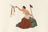 My research indicated that this image of seated Liberty with a staff, shield and Phrygian cap traces its roots through British coinage back to the Roman Empire — so I have restored the rock she originally probably sat on, as well as the plow and wheat sheaves on her shield. Read my full report on the symbolism in the flag here.