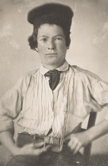 He’s holding a compositor’s stick in which he has “set the letters in reverse so that they would read correctly when the daguerreotype produced a mirror image,” explains the Steamboat Times, which also says the hat is a printer’s cap.