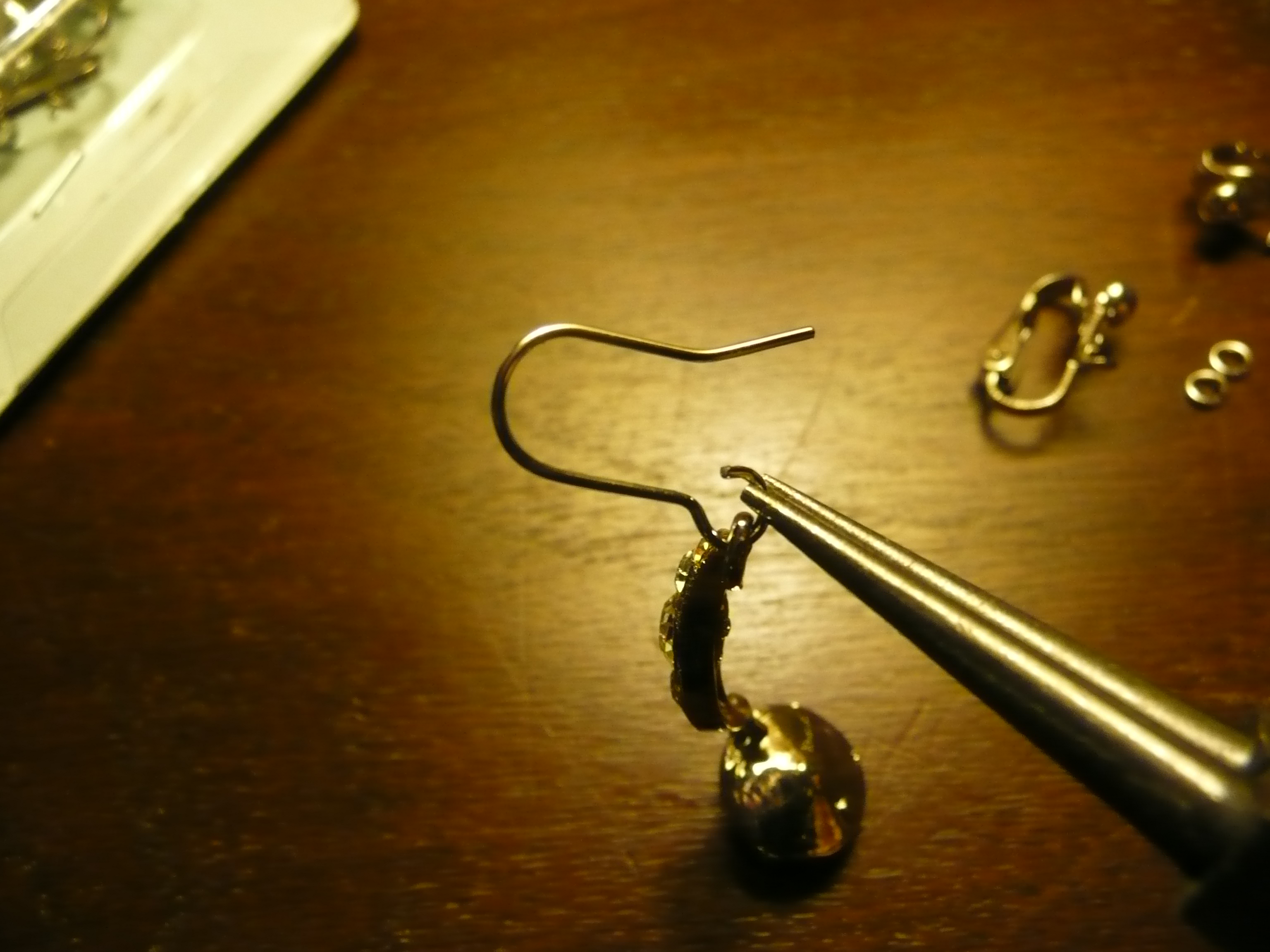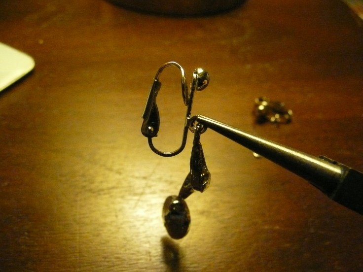 Next, attach the earring to the back. The metal is pretty easy to break with pliers, so be gentle. Here, all I had to do was hook the solid ring onto the open ring. Make sure the dangly part of your dime-store earring faces forward before you close the open ring with pliers.