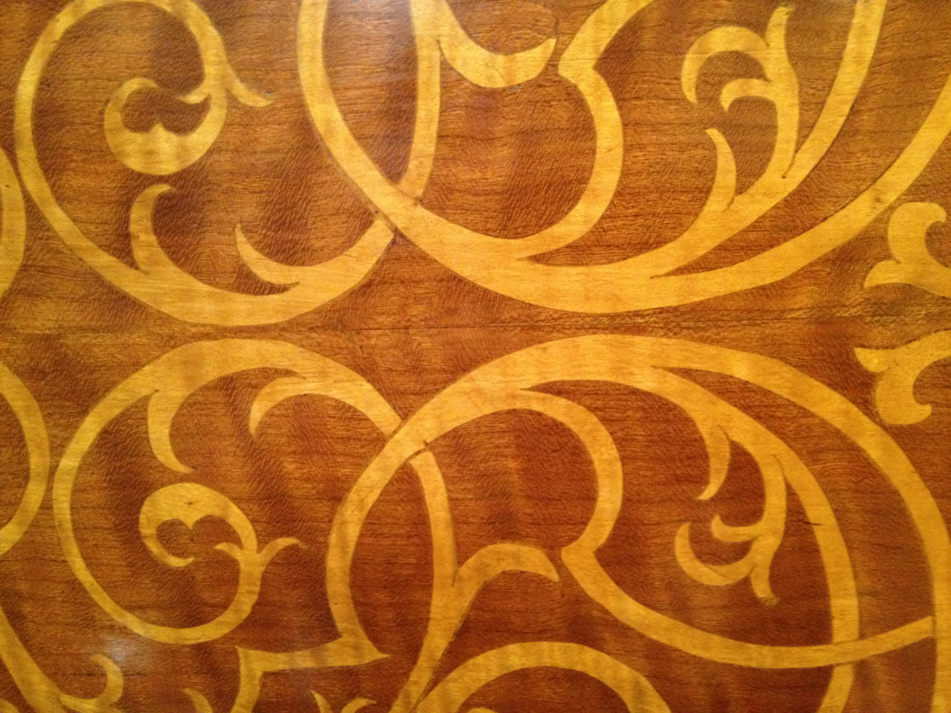 I saw this beautiful thing played at a concert by La Follia Baroque; its player, James, told me about its history. Designed and built by luthier Timothy Johnson of Hewitt, it is a division viol (which the VdGSA says is an English type of bass viola da gamba). Johnson says the inlaid pattern is acanthus (scrolling decoration used since the ancient Greeks and based on a Mediterranean plant), “created using an intarsia technique called tarsi a incastro which was brought to a high level of perfection by George Boule, furniture maker to King Louis XIV. It became a very popular decorative style of the late 17th century for both furniture and musical instruments.”