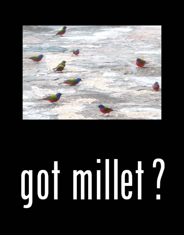 I made this poster a few years ago from a photo I took at my folks’ place. We spread what I called “the river of millet” across the back porch and watched every day right before sunset; it only took the buntings a few days to start turning up en masse. Right about now is a good time to try this. From March 5 to May 22, says Texas A&M’s Texas Breeding Bird Atlas, painted buntings return to Texas from Central America and Mexico to start building nests and laying little blue-grey-white eggs with red markings. They’ll start heading back south at the end of June.
