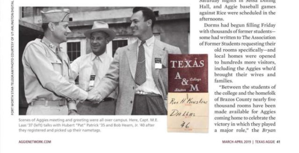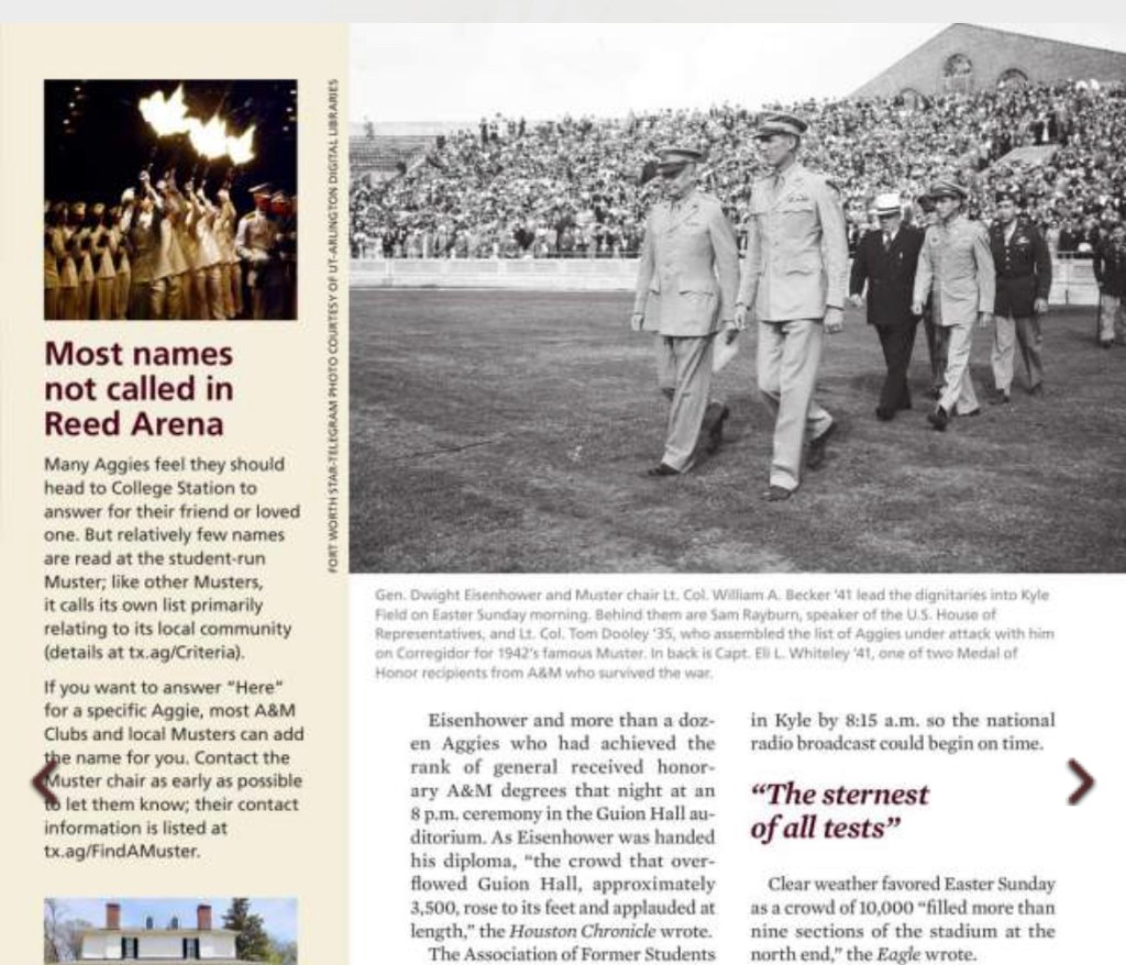 For Presidents’ Day, here’s a story I did about 1946 when (future president) Eisenhower was Muster speaker in Kyle Field as Texas A&M celebrated the end of World War II with a giant homecoming. Thousands of returning A&M servicemen came back for a weekend of dancing, dining, Aggie baseball and the largest Muster that had ever been held.